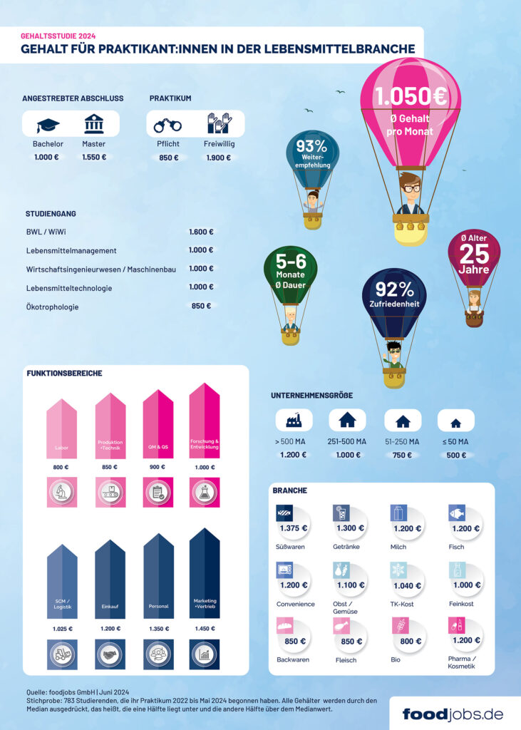 foodjobs.de Gehaltsstudie Praktikum 2024 – Praktikant:innen in der Lebensmittelbranche verdienen durchschnittlich 1.050 EUR brutto im Monat