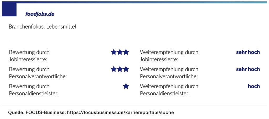 - FOCUS-Business krönt foodjobs.de erneut zum Top-Karriereportal - Weiterempfehlung "sehr hoch" von Jobinteressierten und Personalverantwortlichen -…