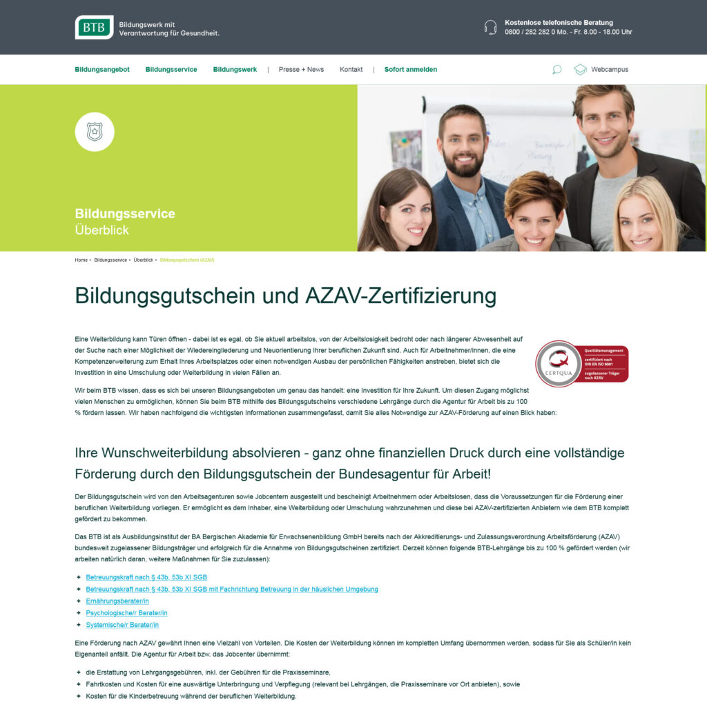 - BTB bietet AZAV-zertifizierte Lehrgänge über bundesweit einlösbaren Bildungsgutschein der Arbeitsagenturen an - BTB erweitert mit…