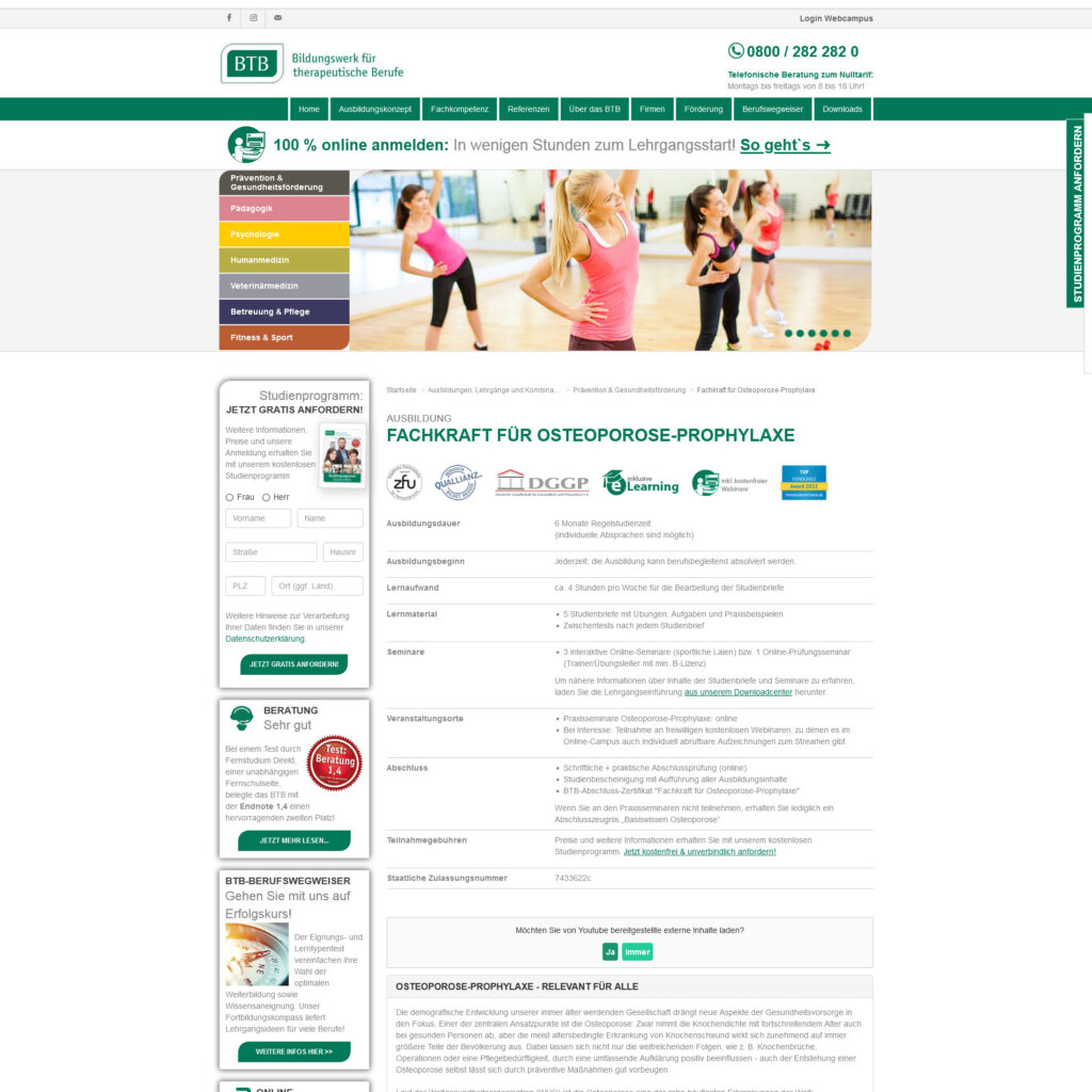 Mit dem neuen Fernlehrgang "Fachkraft für Osteoporose-Prophylaxe" baut das BTB sein Angebot im Bereich Gesundheitsvorsorge und…