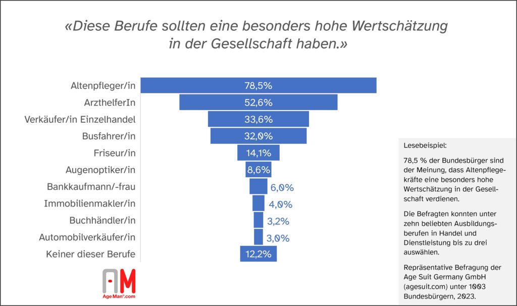 Kaum Wertschätzung für Automobilverkäufer und Buchhändler, höchste Wertschätzung für Altenpflegekräfte und Arzthelfer/innen